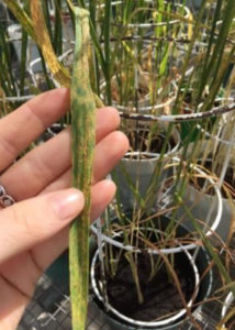 “The germplasm I’m studying for my thesis carries what is known as adult plant resistance (or APR) to tan spot, which has demonstrated to be a durable source of resistance in other wheat pathosystems such as powdery mildew,” said Tamaya.