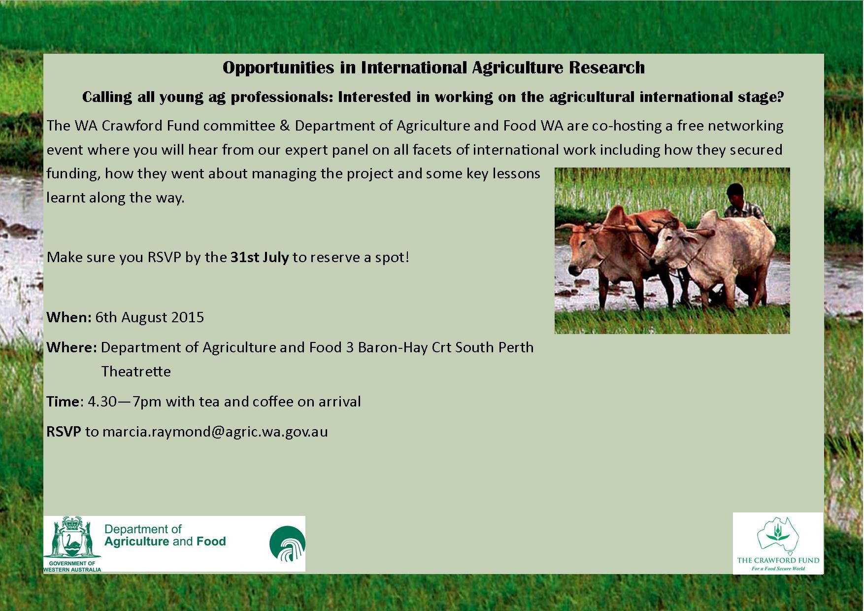 A free networking event for young agriculture professionals is being held in Perth next month. Co-hosted by the WA Crawford Fund committee and the state Department of Agriculture and Food (DAFWA), the event will cover opportunities in international agriculture research.
